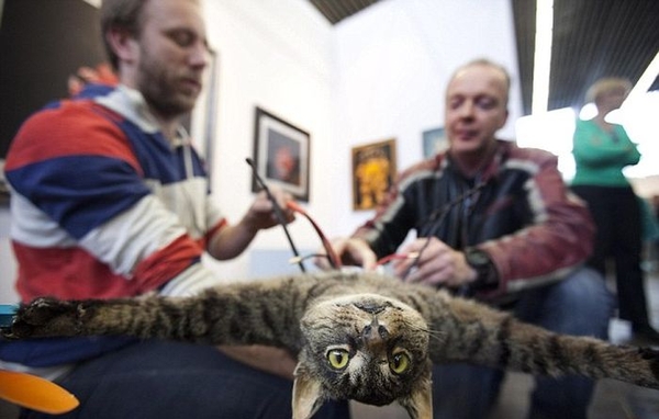 I want to show you a very strange invention from a Dutch artist named Bart Jansen. When his beloved cat was killed by a car, Bart decided to perpetuate his memory is very unusual way :) Using the techniques of taxidermy, he turned his stuffed cat in a real unidentified flying object.